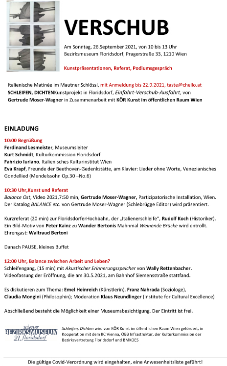 mit Videofassung der Eröffnung am 30.5.2021 von „Schleifen, Dichten“, Kunstprojekt in Floridsdorf, mit „Akustischer Erinnerungsspeicher“ von Wally Rettenbacher.