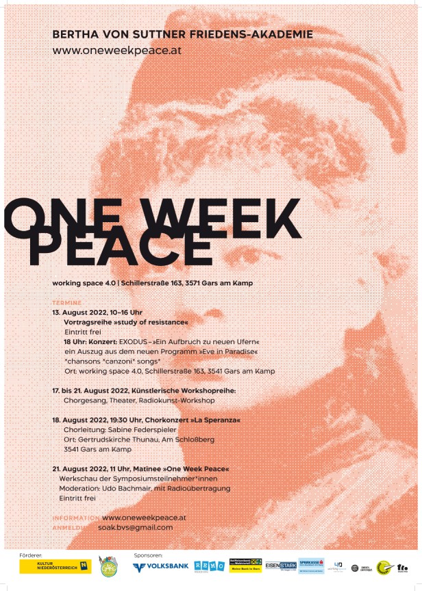 Das Thema Frieden beschäftigt die Menschheit seit jeher und bedeutet vielmehr als nur die Abwesenheit von Krieg. Unter dem Titel „One Week Peace“ möchte die Bertha von Suttner Friedensakademie auf den Wert Frieden in der Jetzt-Zeit Bezug nehmen und bietet drei Workshopreihen für Menschen ab 16 an, die sich mit dem Thema Frieden durch künstlerisches und kreatives Handeln auseinandersetzen wollen. Es geht auch darum die Sinne zu schärfen und konkrete Perspektiven zu entwickeln.