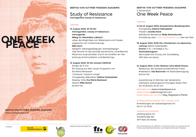 Von 17. bis 21. August 2022 findet in Gars am Kamp die 3. Bertha von Suttner Friedensakademie mit einer Vortragsreihe und mit kreativen Workshopreihen für alle Sinne in den Bereichen Radiokunst,Theater und Gesang statt. Die Ergebnisse werden abschließend im Rahmen einer Matinee, die von Udo Bachmair moderiert wird, vor Publikum performt und präsentiert.