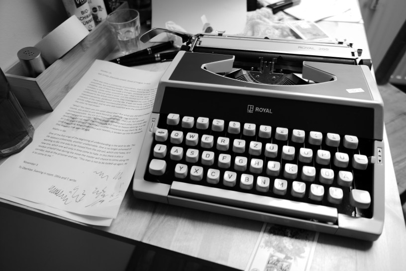kafkaeskes Synchrontypewriting (blue octave notes) on Litton Royal 200 Typwriter while reading excerpt of Raimund Bahr Journalentries 2024. synchrontypewriting: pinski aka Marcus D. Niski; reading & voice: retti